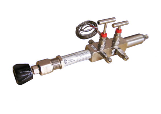 The Variable Pressure Reducer with Thermal Safety valve (VRTS) is used to reduce the pressure and control the flow of high-pressure steam and liquid samples, and shut off the sample line for high sample temperature. The VRTS is a compact version for pressure reduction. The pressure of the incoming sample is reduced as the liquid is forced to travel through the narrow gap between the tapered rod and the rod opening. Because the work is done over the entire length of the rod, localized wear is held to a minimum. The result is a very long service life compared with devices in which the pressure drop is taken over a very short distance (fixed orifice, pressure regulator, etc.). Other devices erode frequently causing function loss and down time. Thermal shut off valve at the end will close if sample temperature increases by preset value. These type of pressure reducers are recommended by ASME 19.11-1997.